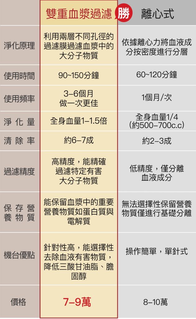 雙重血漿過濾術不同於傳統的離心技術或洗腎療程,其針對性更強,且專為預防健康設計,無需運用代用血漿、無需像洗腎一樣代替腎臟功能。