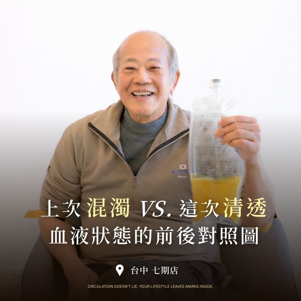 林先生,67歲,長年患有糖尿病與高血脂並且一天一包菸,上一次血液淨化,觀察到洗出的廢液狀態較為混濁,參雜很多血脂防、發炎物質以及代謝廢物。