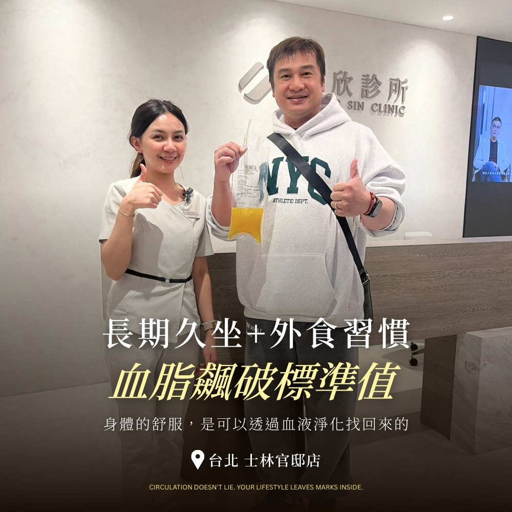 陳先生的身材也逐年變化,從原本精壯結實,到後來出現明顯的腹部脂肪。雖然常常覺得容易疲勞,但他總覺得是「年紀到了」、「工作太累」,就沒多在意。直到做了健康檢查,報告出來後,陳先生震驚不已——三酸甘油酯竟高達800多,而總膽固醇也突破了300,醫師甚至警告他已經進入極高風險區,隨時可能引發心血管意外。經朋友推薦,陳先生來到正欣診所,希望能透過血液淨化療程與專業的協助,幫助他把健康拉回來。